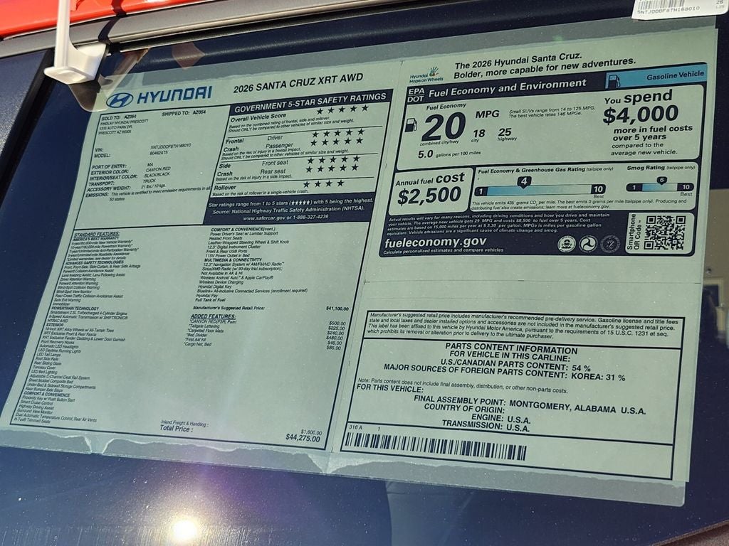 **This 2026 Hyundai Santa Cruz XRT is equipped with 2.5L I4 AWD**, ** and this Santa Cruz is trimmed in Canyon Red with Black interior**, 3.51 Axle Ratio, 4-Wheel Disc Brakes, 6 Speakers, ABS brakes, Air Conditioning, Alloy wheels, AM/FM radio: SiriusXM, Apple CarPlay & Android Auto, Auto High-beam Headlights, Auto-leveling suspension, Automatic temperature control, Bed Cargo Net, Bed Divider, Bodyside moldings, Brake assist, Bumpers: body-color, Carpeted Floor Mats, Compass, Delay-off headlights, Driver door bin, Driver vanity mirror, Dual front impact airbags, Dual front side impact airbags, Electronic Stability Control, Emblem Kit, Emergency communication system: None, Exterior Parking Camera Rear, First Aid Kit, Four wheel independent suspension, Front anti-roll bar, Front Bucket Seats, Front Center Armrest, Front dual zone A/C, Front reading lights, Fully automatic headlights, H-Tex Leatherette Seat Trim, Heated door mirrors, Heated Front Bucket Seats, Heated front seats, Illuminated entry, Leather Shift Knob, Leather steering wheel, Low tire pressure warning, Navigation System, Occupant sensing airbag, Option Group 01, Outside temperature display, Overhead airbag, Overhead console, Panic alarm, Passenger door bin, Passenger vanity mirror, Power door mirrors, Power driver seat, Power steering, Power windows, Radio data system, Radio: AM/FM/HD Audio System, Rear anti-roll bar, Rear reading lights, Rear side impact airbag, Rear step bumper, Rear window defroster, Remote keyless entry, Security system, Speed control, Speed-sensing steering, Split folding rear seat, Spoiler, Steering wheel mounted audio controls, Tachometer, Telescoping steering wheel, Tilt steering wheel, Traction control, Trip computer, Turn signal indicator mirrors, Variably intermittent wipers, Wheels: 18 x 7.5J Alloy with XRT-Exclusive Design. Price includes: $250 - Hyundai HMF Dealer Choice : $250 discount. $44.05 per $1000 financed. Available to well qualified buyers who finance through Hyundai Motor Finance. H704. Exp. 02/02/2026