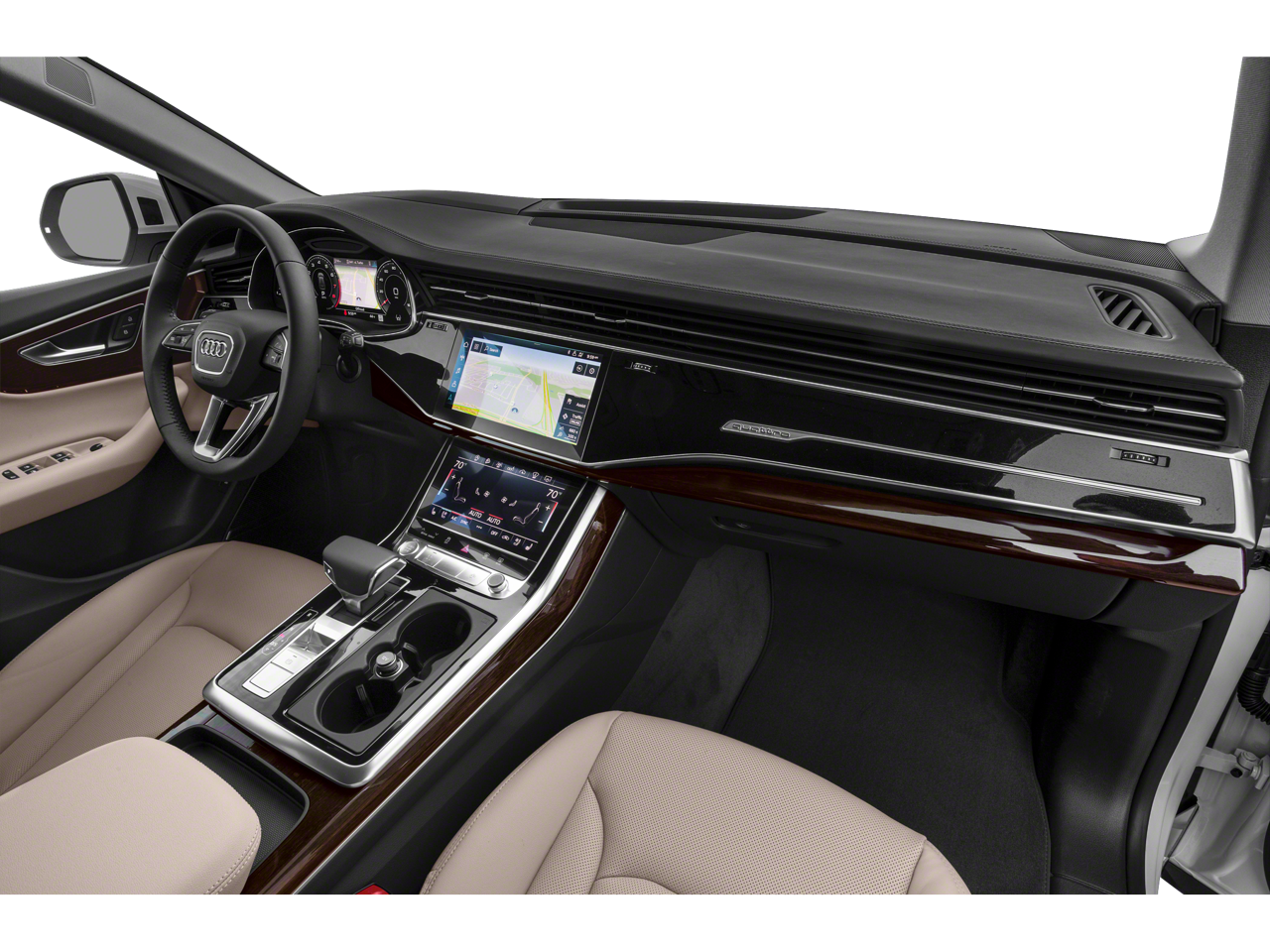 The exterior of this Q8 exudes a bold, sophisticated style with its sleek black finish and 20-inch 5-spoke wheels. Step inside and you'll be surrounded by premium leather seating, a panoramic sunroof, and a state-of-the-art infotainment system with seamless smartphone integration.